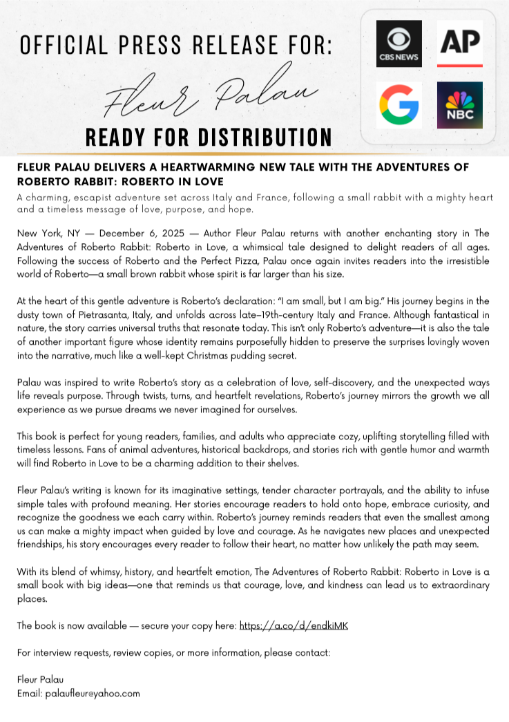 NEW YORK CITY, NY, UNITED STATES, December 9, 2025 /EINPresswire.com/ — Author Fleur Palau returns with another enchanting story in The Adventures of Roberto Rabbit: Roberto in Love, a whimsical tale designed to delight readers of all ages. Following the success of Roberto and the Perfect Pizza, Palau once again invites readers into the irresistible world of Roberto, a small brown rabbit whose spirit is far larger than his size.